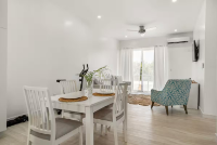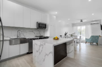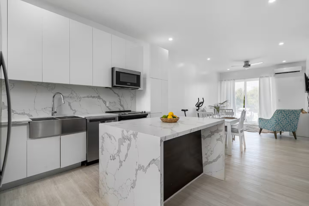 Modern 1BR/1.5BA apartment in peaceful Miramar West, Nassau. Enjoy a stylish space with reliable WiFi, AC, full kitchen, and free parking. Miramar West is a quiet, safe (gated) community, just minutes from beaches (Love Beach), dining (Solemar, Aquafire) and about 5-min drive from Old Fort Bay Shopping Plaza. The open-plan living and dining area is filled with natural light, creating a warm and inviting atmosphere perfect for relaxing. The well-equipped kitchen boasts sleek countertops, ample cabinet space, and modern appliances, including a refrigerator/freezer, stove, oven, dishwasher, microwave, and washer/dryer. The generously-sized bedroom features plenty of natural light and ocean views with a huge closet, providing a peaceful retreat at the end of the day. The stylish bathroom includes a rainfall shower, double vanity, and modern fixtures. The apartment complex offers additional amenities, such as a swimming pool, fitness center, backup generator, and top floor viewing point of the ocean and sunset. Stunning Love Beach is within easy walking distance.