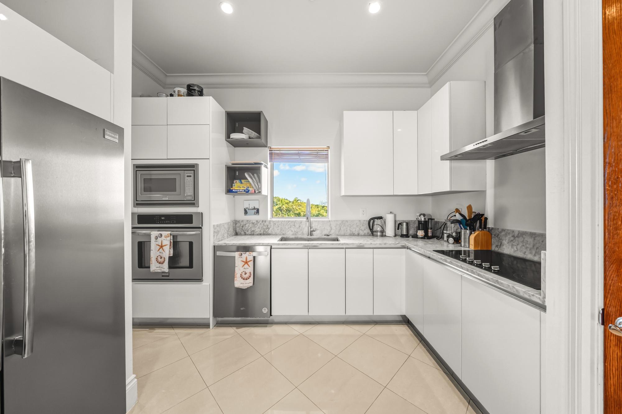 Welcome to Caves Heights, where this thoughtfully designed third-floor residence invites you into a serene coastal retreat. Offering 3 bedrooms and 3.5 bathrooms across 2,439 square feet, the home is crafted for effortless oceanfront living. Each bedroom features a spacious ensuite, while the expansive open-concept living and dining areas open directly onto a private terrace showcasing sweeping ocean views. At the heart of the home is a fully renovated custom kitchen, immediately captivating upon entry and designed as the centerpiece of the space. Outfitted with stainless steel appliances, carefully selected lighting, the kitchen is perfectly suited for both everyday living and elegant entertaining.