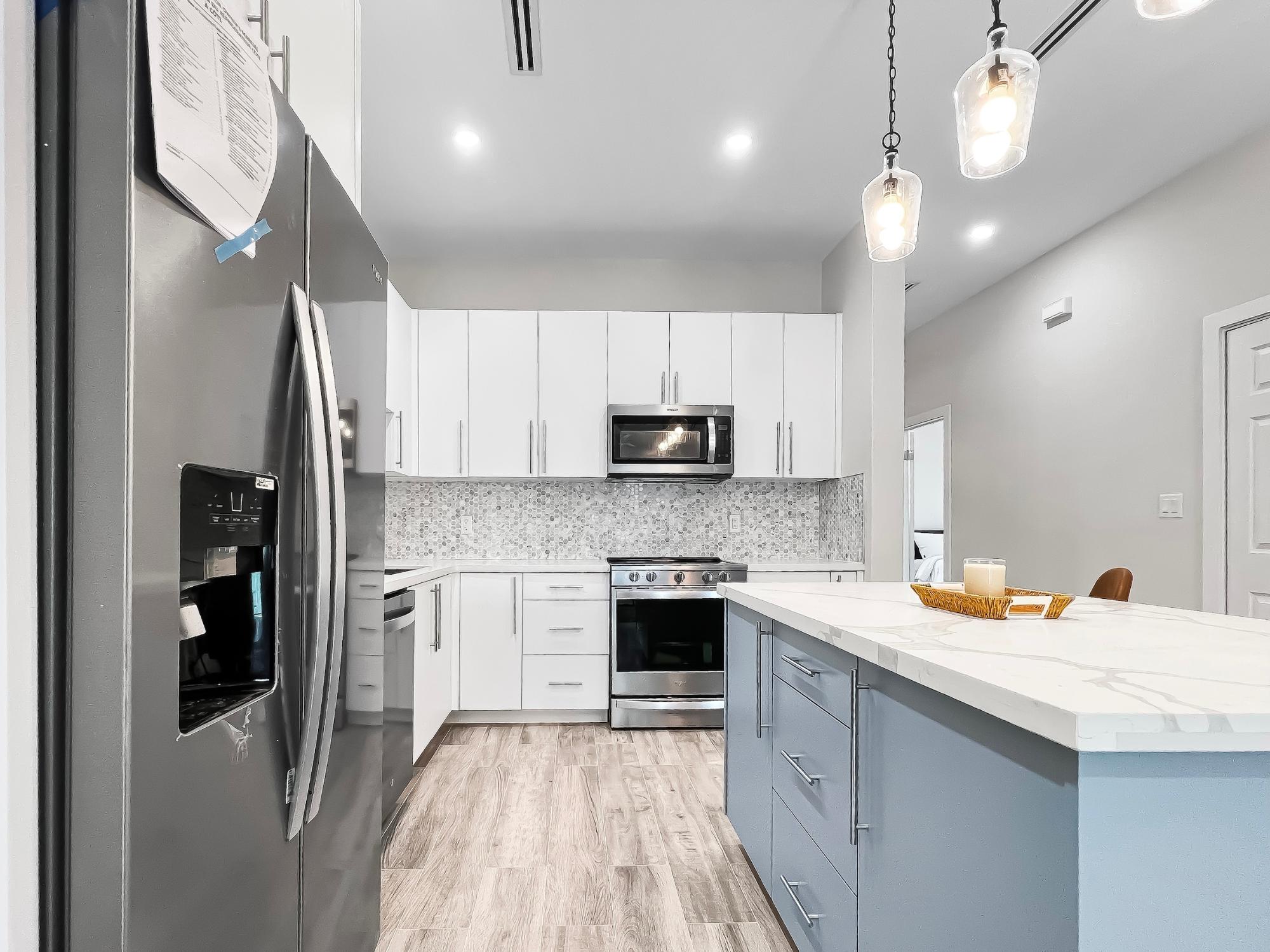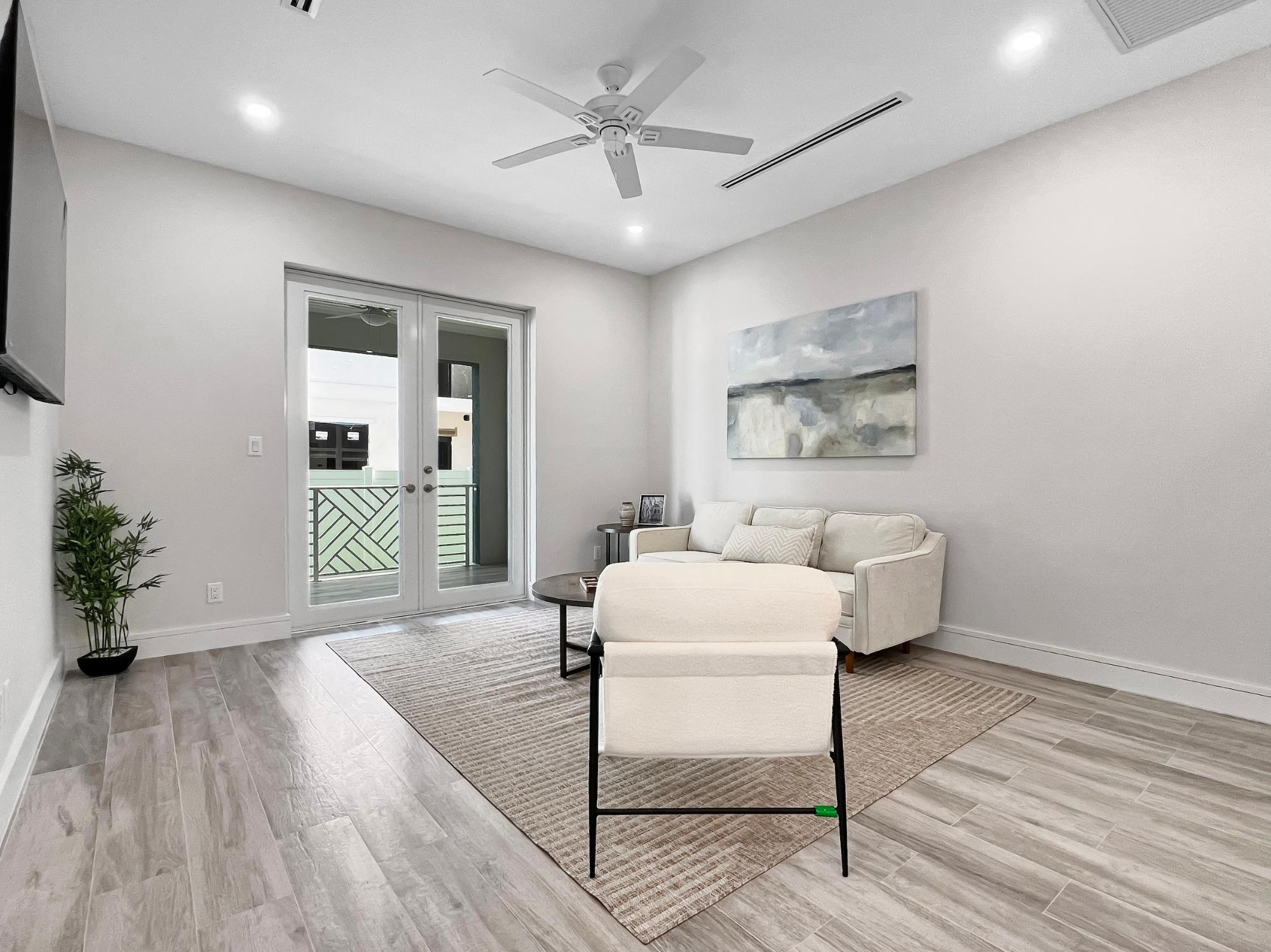 This brand-new rental, just steps away from the iconic The Islands Caves" and a pristine stretch of white sandy beachfront, is now available for rent. Offered fully furnished, the unit is located within the gated community of Caves Terrace, a section of the increasingly popular Westlake Plantation community. From the moment you walk through the impressive 8-foot entryway, you are welcomed into a contemporary interior featuring high ceilings and stylish modern accents. Each room is thoughtfully designed with generous space, built-in closets with shelving, and an abundance of natural light. The guest bedroom features a contemporary queen bed, while the primary suite offers a king bed, a spacious walk-in closet, and a well-appointed bathroom with dual vanities and a frameless glass walk-in shower. The living room features tall impact doors that open onto the covered patio, creating approximately 140 sq. ft. of outdoor living space. With an additional seven units available for rent within the same complex, this property is an excellent option for companies or organizations