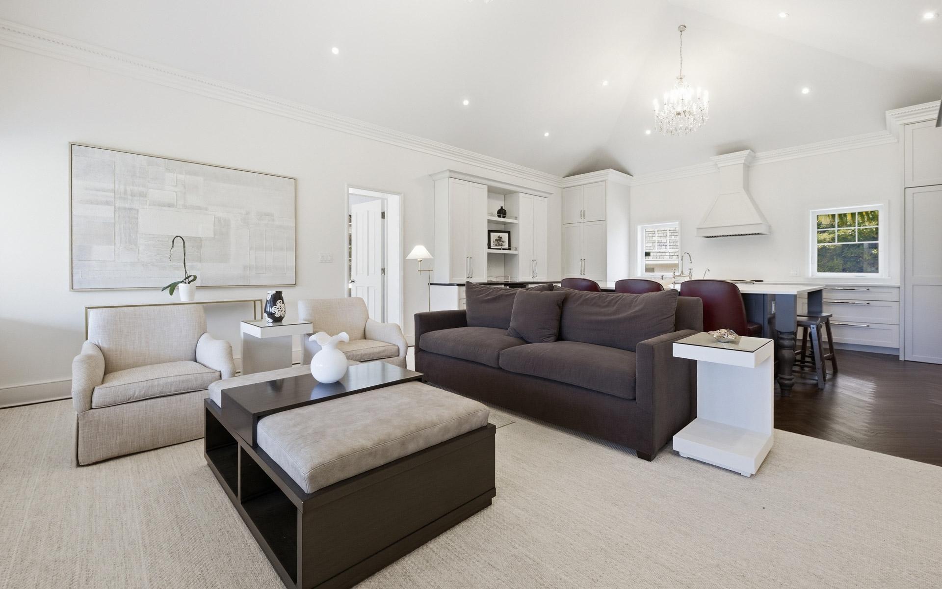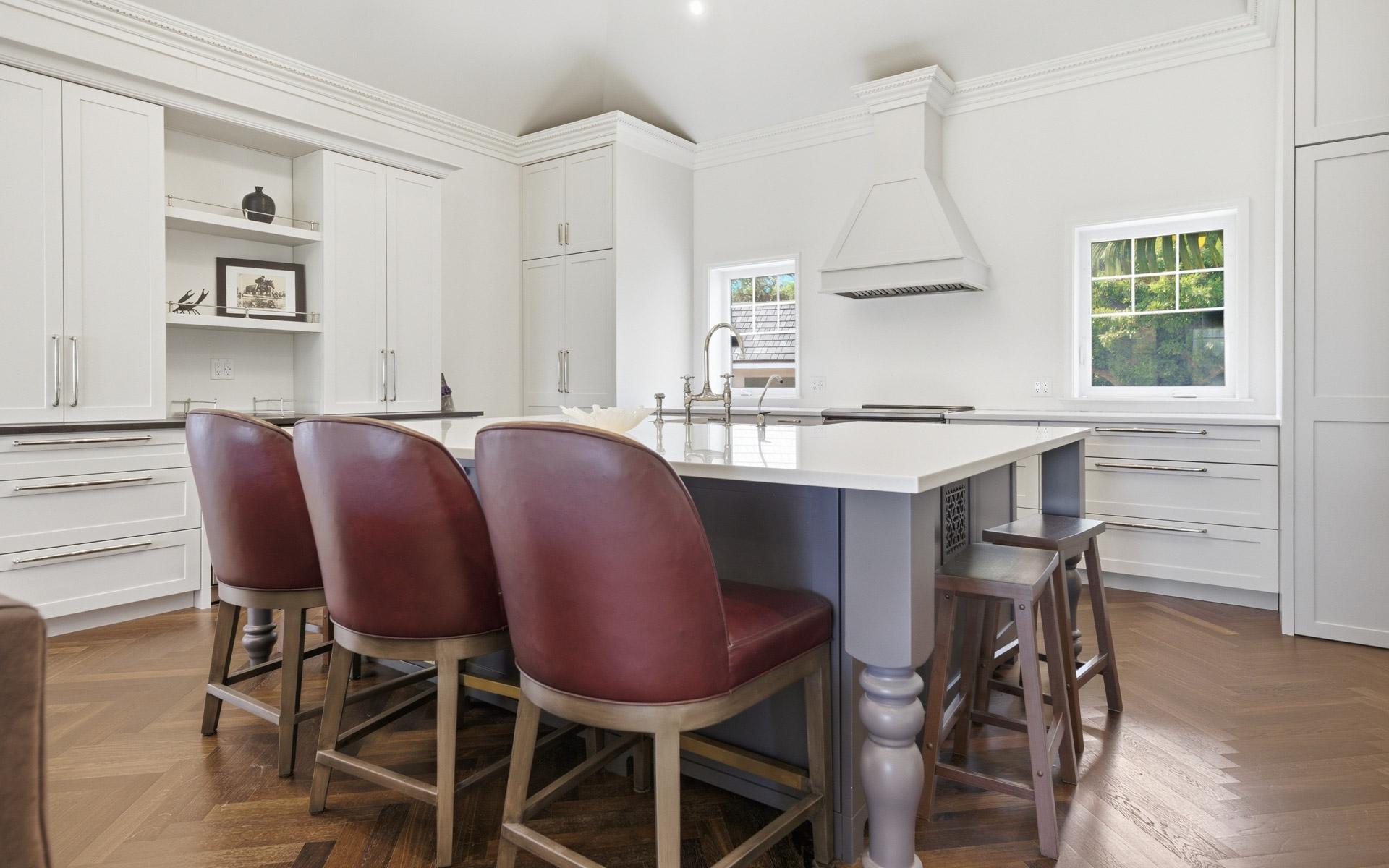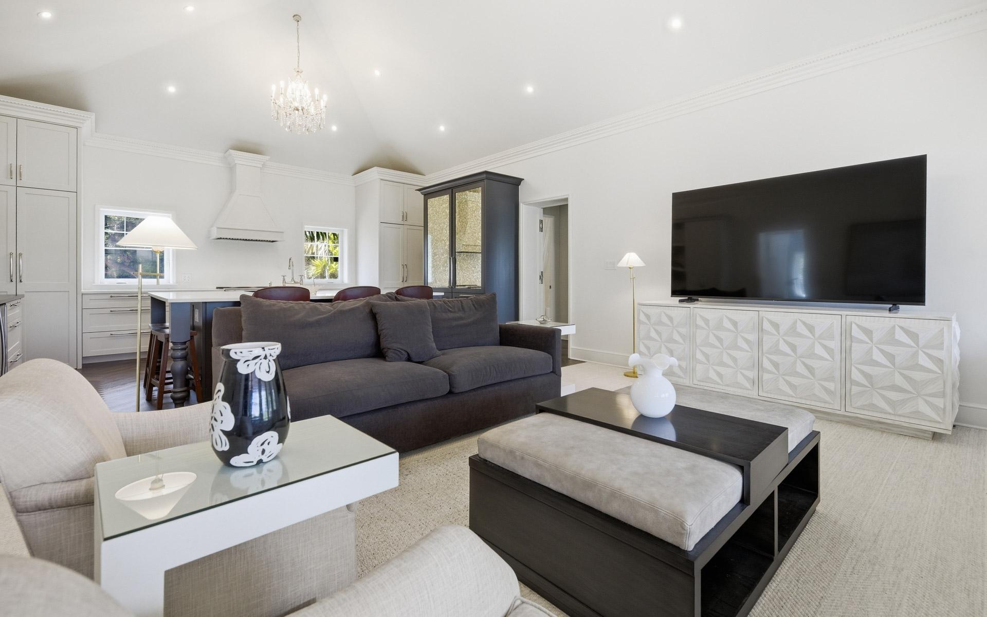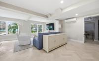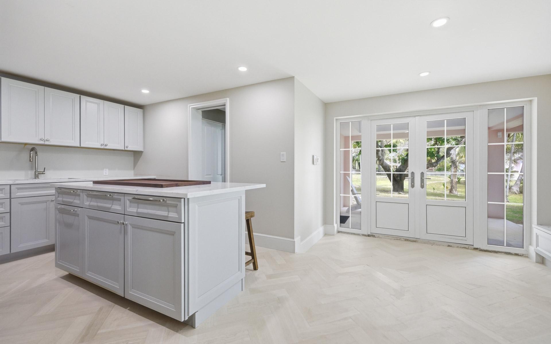 Coconut Point is perhaps the last large beachfront estate parcel with dockage on picturesque Eastern Road. Spanning two lush acres, the grounds feature mature landscaping anchored by two magnificent Poinciana trees, a sprawling mango tree, and various coconut palms. This unique property boasts 180 feet of beachfront highlighted by a natural rock outcrop extending from the shore to the ocean on its western edge, a secluded natural 'hot tub' carved directly into the coastline, and one of the finest private marinas in The Bahamas. Capturing stunning views of the grounds, Montagu Bay, and Athol Island beyond, the newly revamped 2,500-square-foot, turn-key main residence offers two distinct living levels and is ideally suited as a guest cottage. Upstairs, there is an immaculate, well-appointed two-bedroom living space with walk-in closets, an open-concept kitchen with vaulted ceilings, and a living area with herringbone oak floors. The chef’s kitchen has beautifully crafted cabinetry and integrated appliances, including a decorative fridge/freezer.