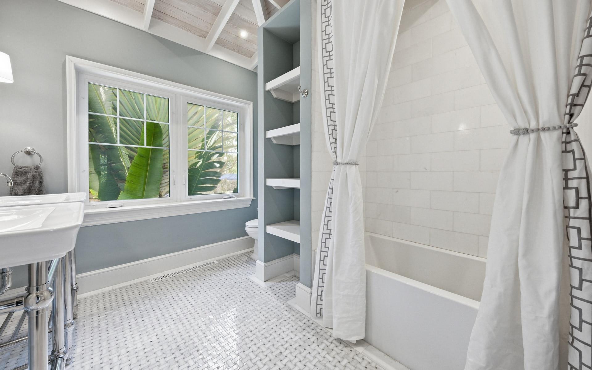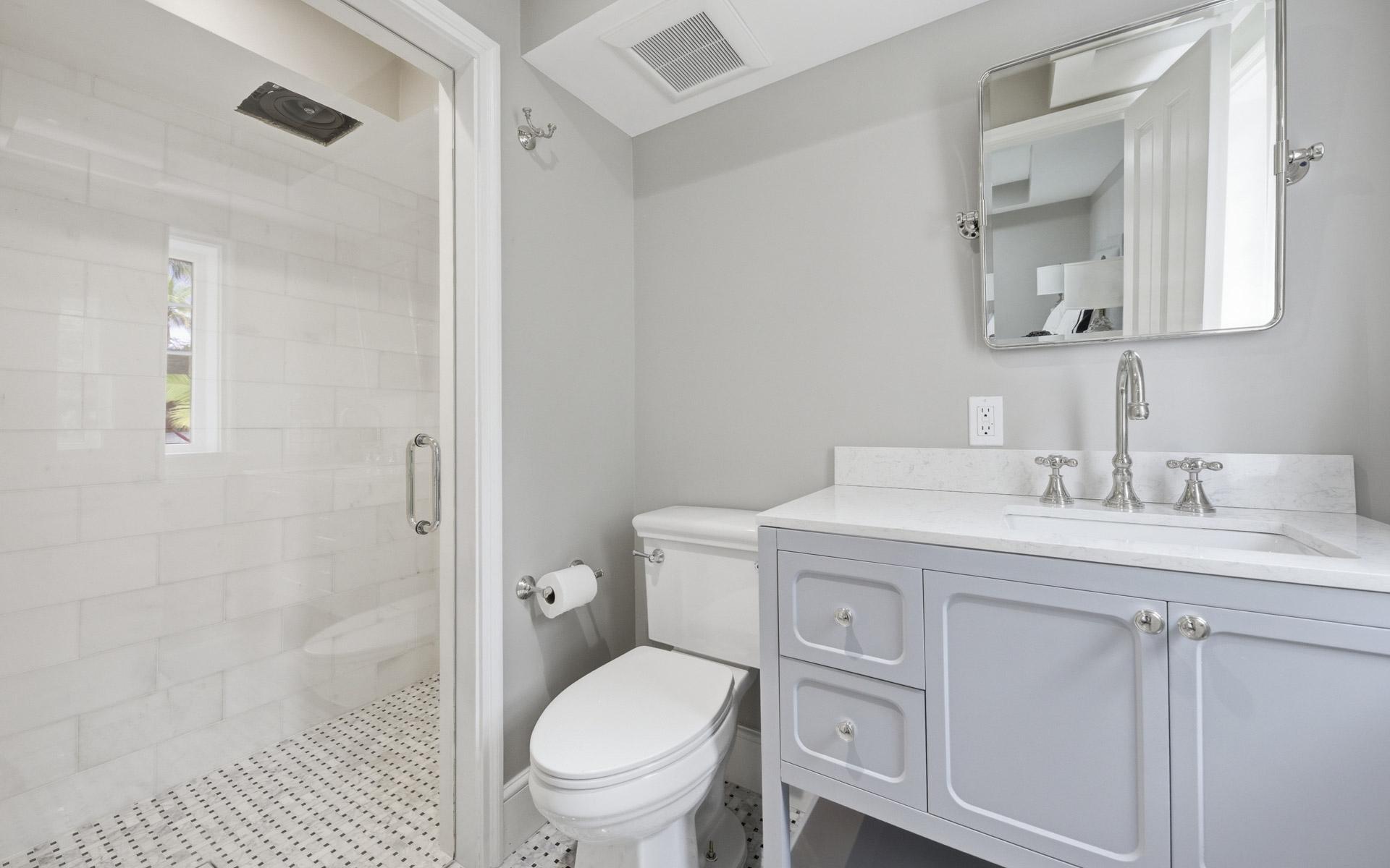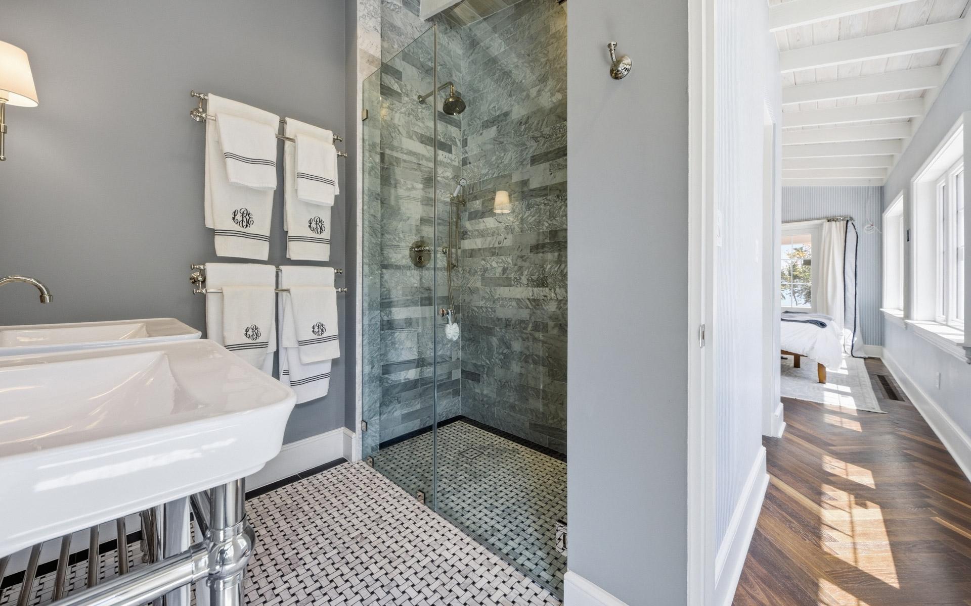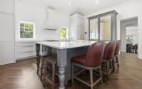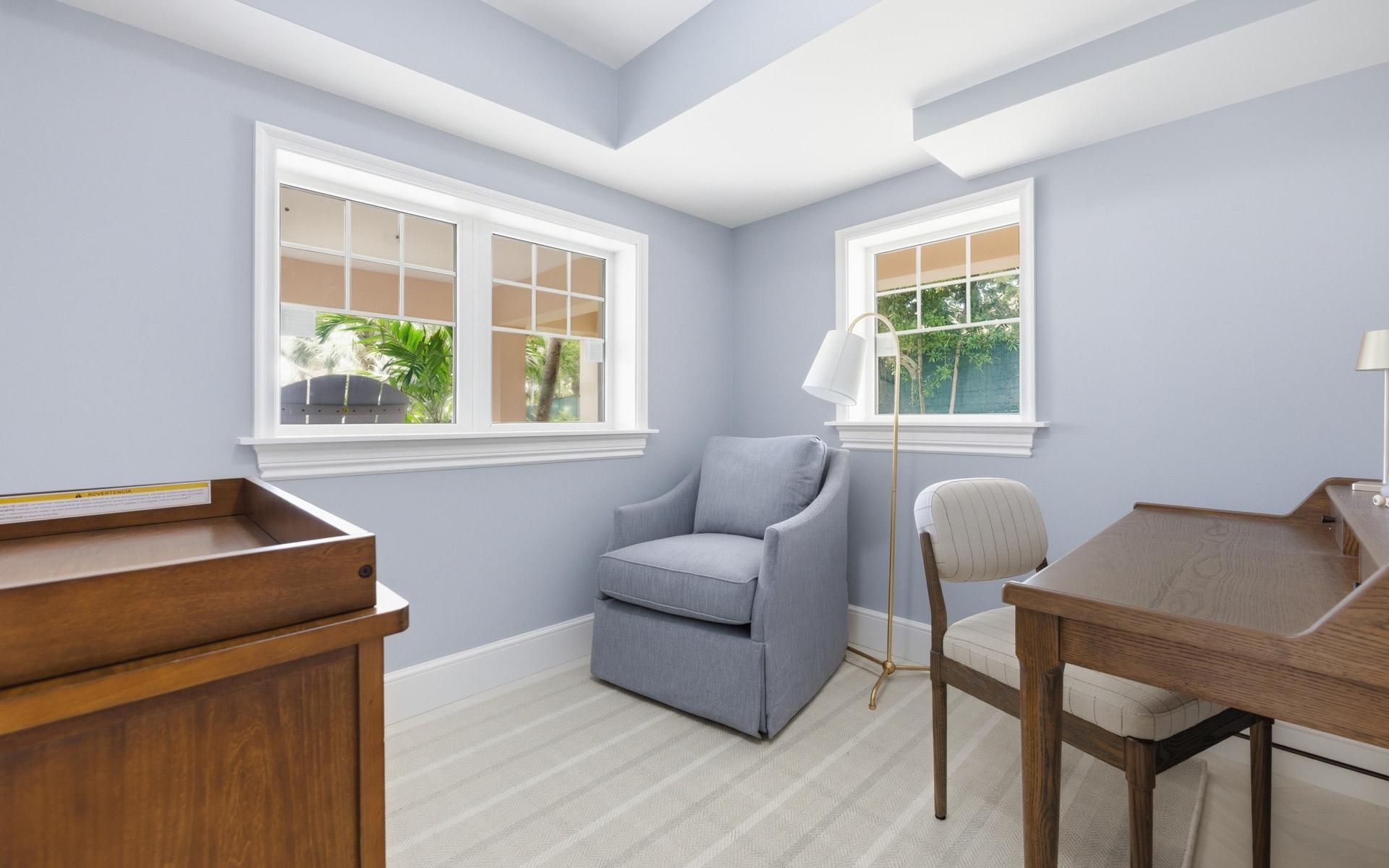 Coconut Point is perhaps the last large beachfront estate parcel with dockage on picturesque Eastern Road. Spanning two lush acres, the grounds feature mature landscaping anchored by two magnificent Poinciana trees, a sprawling mango tree, and various coconut palms. This unique property boasts 180 feet of beachfront highlighted by a natural rock outcrop extending from the shore to the ocean on its western edge, a secluded natural 'hot tub' carved directly into the coastline, and one of the finest private marinas in The Bahamas. Capturing stunning views of the grounds, Montagu Bay, and Athol Island beyond, the newly revamped 2,500-square-foot, turn-key main residence offers two distinct living levels and is ideally suited as a guest cottage. Upstairs, there is an immaculate, well-appointed two-bedroom living space with walk-in closets, an open-concept kitchen with vaulted ceilings, and a living area with herringbone oak floors. The chef’s kitchen has beautifully crafted cabinetry and integrated appliances, including a decorative fridge/freezer.